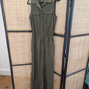 Lightweight olive green jumpsuit with 2 decorative breast pockets and 2 front pockets