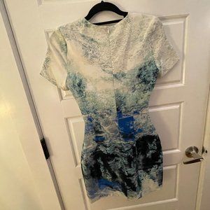 Bec & Bridge watercolor blue and white mini dress with short sleeves