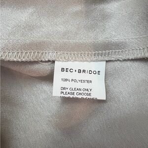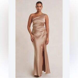 This stunning gown by Bec + Bridge features a sleek one-shoulder design in a sophisticated gray hue, perfect for cocktail events. The floor-length silhouette and ruched waist detail create an elegant and flattering look. Its minimalist style and flowing fabric make it a versatile choice for any formal occasion.