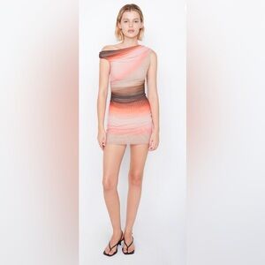 Make a statement in the BEC + BRIDGE Louna Mini Dress, crafted from a soft mesh fabric. The mini features an asymmetrical off-shoulder neckline and ruching at seams for a flattering fit.