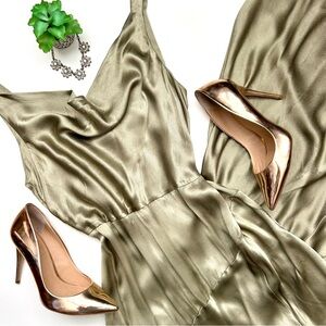 This sage green satin cowl neck maxi dress Moon Dance gown from Bec + Bridge is beautiful