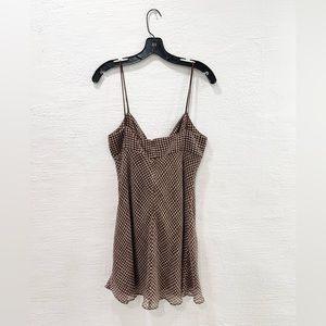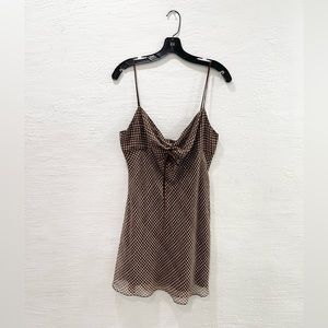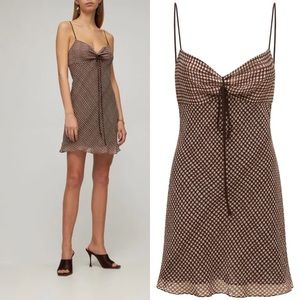 Condition is new with tags. Curated from scrumptious silk material with an everlasting checkered print all over. Features a sweetheart neckline, fixed slinky spaghetti straps, front self-tie detailing for extra oomph, and concealed back zip closure.
