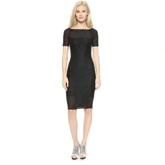 Lattice-like eyelets and a raw hem lend sexy edge to this bodycon Bec & Bridge little black dress.
