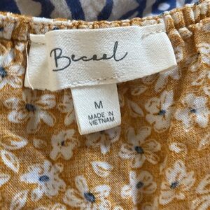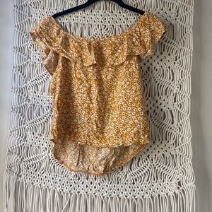 Charming daisy floral off-shoulder top by Becaal featuring a feminine ruffled neckline for a soft, romantic look. Designed to be worn off the shoulders, this top offers a flattering fit that works well for casual, spring, or summer styling. Marked as size Medium.