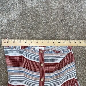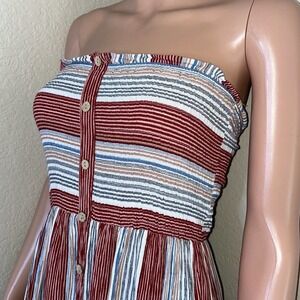 Striped sundress, strapless button front dress, red and blue midi dress, casual summer tube dress, boho beach style dress, sleeveless bandeau dress, lightweight cotton dress, vertical stripe pattern, women’s vacation outfit, chic casual midi sundress