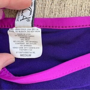 Dark pink and purple, medallion detail in the middle, ties at the neck, hooks in back, great condition!