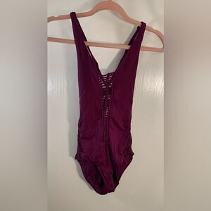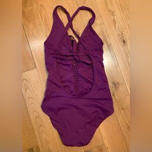 Becca EUC purple woven cutout v neck tie back one piece swimsuit Size small