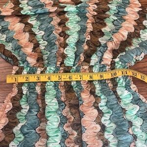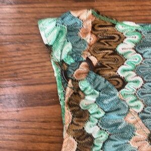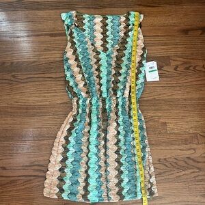 Plunge v-neck dress features a multi-colored crochet fabrication with a smocked blouson waist and offers ring details at shoulder strap.