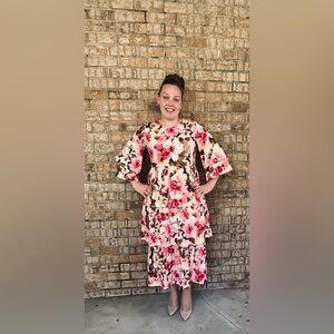 As a product expert, I recommend the Becca Ruffle Dress for its versatile ruffle detailing and convenient pockets. This floral maxi dress is available in sizes small through 3x, providing a gorgeous and comfortable option for a variety of body types. Make a statement in pink and green with this must-have addition to your wardrobe.