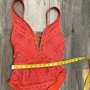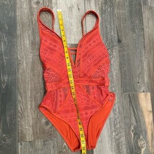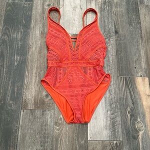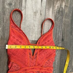 Becca Show & Tell Plunge Swimsuit Lace Crochet Burnt Orange XS