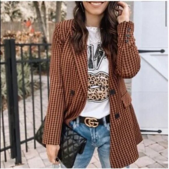 Becca Tilley x Bar III Blazer Jacket Coat Powersuit Gingham Plaid Brown Size XL
