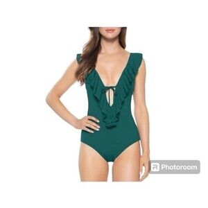 Becca by Rebecca Virtue Women's Ruffle Plunge One Piece Swimsuit Green L