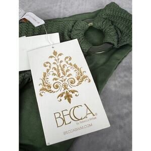 This is a Becca bikini bottom in size XS with a ribbed texture. The color is cactus green, featuring O-Ring accents. Made of nylon and spandex, this hipster style bottom is designed for women with moderate coverage and stretch. It is part of the Line In The Sand collection, perfect for beach or swimwear occasions. Remember to hand wash only to maintain its quality.