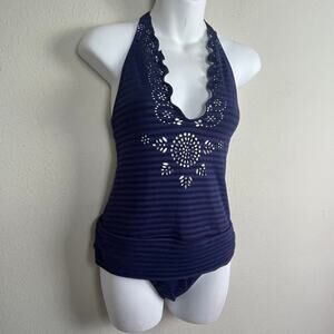Becca by Rebecca Virtue One Piece Swimsuit M Blue Stripe Halter Laser Cut