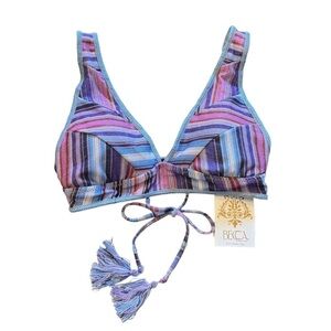 Teagan triangle top features a stripe pattern on silver metallic fabric with threaded edge stitching, diagonal inset seaming, and removable halter cups. Offers a supportive under bust band, adjustable shoulder straps and loop ties at back with multi colored tassel ends.