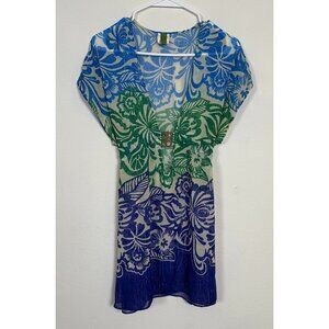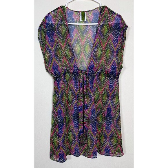 Lightweight and sheer with a vibrant multicolor snakeskin-inspired design, this Becca by Rebecca Virtue cover-up is perfect for poolside lounging or beach getaways. Features a decorative belt with silver-toned beads, a deep V-neckline for a flattering fit. Tagged size XS/XP-SP (Extra Small / Pequeño – often labeled for bilingual markets). Material: 100% Polyester Condition: Good preowned condition. Measurements: • The pit-to-pit measurement is approximately 22 inches, and it features a drawstring at the waist so you can adjust the fit to your liking. • The length from shoulder to hem is about 33 inches. Add this statement piece to your swimwear rotation – it’s both fierce and feminine!