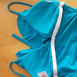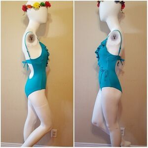 Fluttery ruffles highlight the pretty V-neckline of a color-pop wrap swimsuit that ties in back for a supportive fit. Excellent gently used condition.