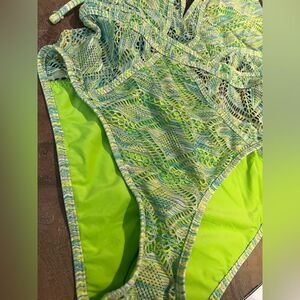 Becca Mosaic Kiwi show and tell Stylish one-piece swimsuit in vibrant green and yellow. Features a unique pattern and flattering cut. this is brand new, never been worn and still has the. Liner. Size M NWT