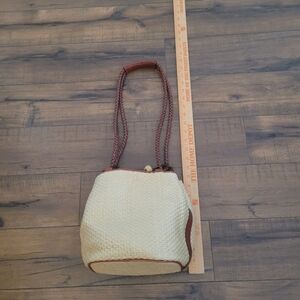 Excellent pre owned condition. Bechamel 90's Brown Leather Cream Woven Bucket Bag. Leather straps. Aycrlic Tortoise rings. Stone bag accent. Fully lined. See pictures for measurements.
