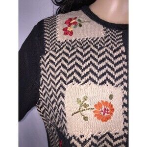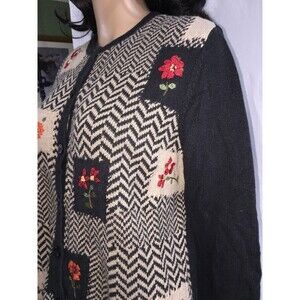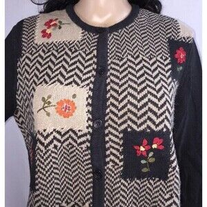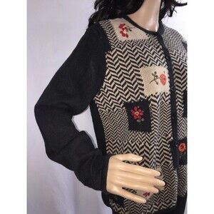 FEATURES/DESCRIPTION: High neckline with full front button down, long sleeves, below waist length, casual fit. Solid black back and sleeves with chevron knit front accented with patches of delicate ribbon flowers. Cute and unique. Soft, stretchy, comfortable sweater.