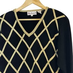 Bechamel Gold Black V Neck Sweater Size MEDIUM Lattice Trellis Grid Lambswool