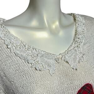 Bechamel White Hand-Knit Sweater with Lace Collar & Holiday Bow Design, Size M