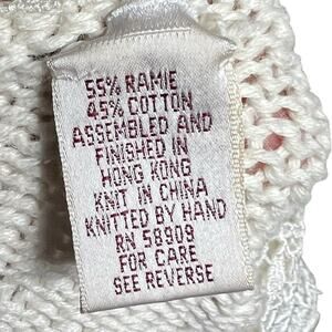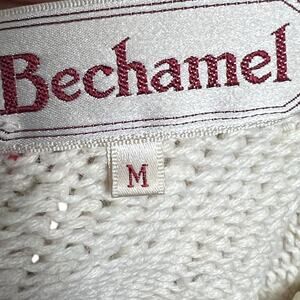 This vintage Bechamel sweater is a charming piece that beautifully combines cozy comfort with festive flair. Made from a soft blend of 55% ramie and 45% cotton, it features an intricate hand-knitted texture and a delicate lace collar, adding a touch of sophistication. The sweater’s front showcases a bold and playful holiday-inspired design—a bright red bow adorned with holly leaves and berries, making it perfect for the holiday season or a special winter gathering.