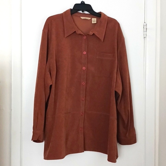 Button cuff. Pretty brown Suede Cloth has decorative stitching still in tact. Poly spandex blend for comfort. Very nice cool weather Jacket.