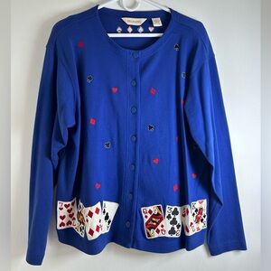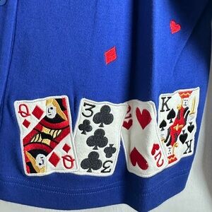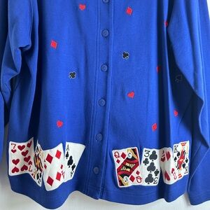 Very pretty blue cardigan sweater buttons down with a round neckline and long sleeves. The card suit symbols (spades, hearts, diamonds, and clubs) are scattered across the upper portion of the sweater. It is in excellent condition.