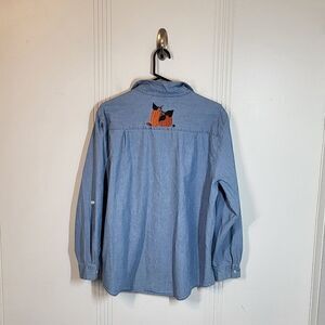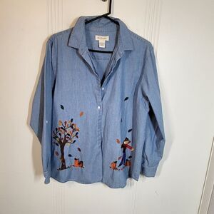 Bechamel denim embroidered buttoned down blouse. Size large. 100% cotton.