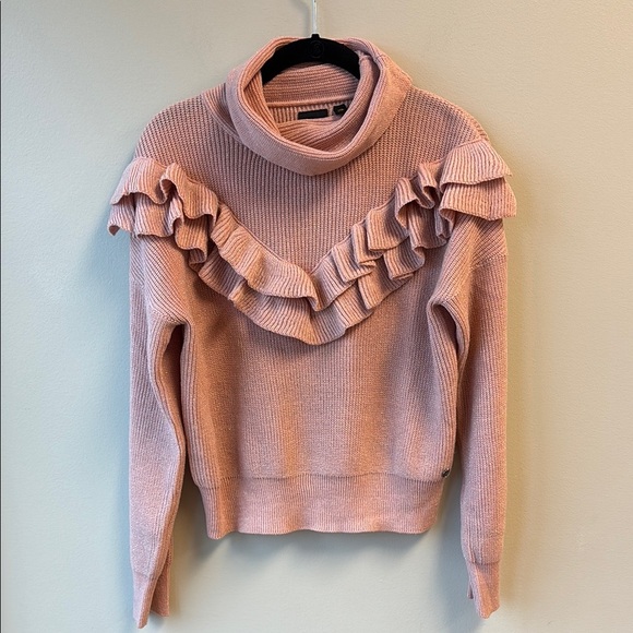 Stay cozy and stylish with this pink ruffled turtleneck sweater. Perfect for any occasion.