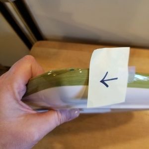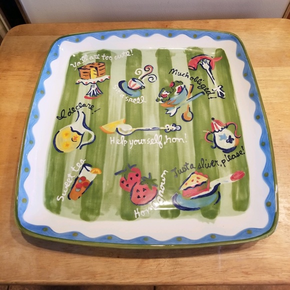 11 1/2" square, multi-colored serving platter. Pre-owned, good condition - no cracks or crazing - two tiny chips on the lip of the tray (see pics). Becky's signature is on the back of the tray. Recommend hand washing. From a smoke free/pet free home.