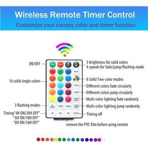 🧿The canopy string lights can be controlled with remote. There are 18 different color options and 7 multicolor(twinkling and flashing). It also has 3 timer (4 hours on/20 hours off, 6 hours on/18 hours off, 8 hours on/16 hours off).