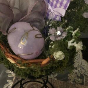 Another chair spring creation …this one has an adorable title checkered bunny with moss and the prettiest lavender egg…measures 9 inches