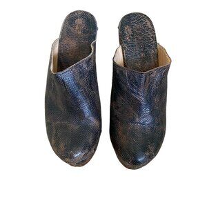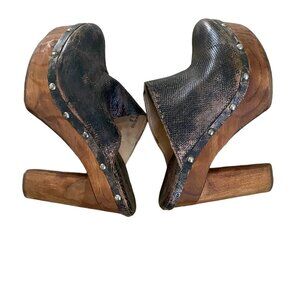 Stylish Bed Stu mules. Blue leather upper. Brown wooden heel. Studded accents.