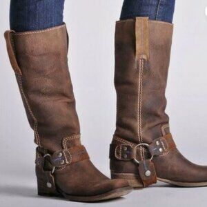 Bed Stu Opal boots, known for their weathered finish, harness detailing, square toe and a 13-inch tall shaft