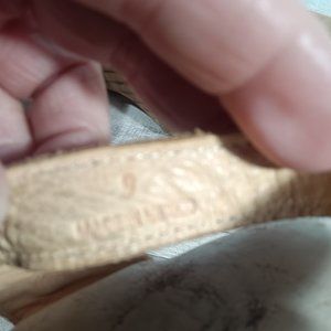 Pre-loved and in good condition. Slingback heel featuring cutouts, an eco-friendly pine heel, and a cushioned insole. Color: Nectar Lux