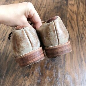 Fabulous lace up oxfords by Bed Stu. “Fury” saddle shoe style in two tone tan & taupe leather with brown cord laces. Intentional distressing / color variation to leather. Size 6, great preowned condition with some wear on heels & sole (see photos).