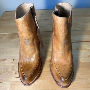 New with Tags Bed Stu Isla Distressed Leather Booties Materials and specs Chrome and formaldehyde free, vegetable tanned leather High heel bootie in our unique finishes with antique brass buckle Goodyear welted leather sole 3.5 inch shaft height, 3.5 in. hollow wood leather wrapped heel Handmade and hand finished Cobbler series short boot in Leon, Mexico Isla is an essential for all who love a leather heeled bootie. Isla is a proven fan favorite. Show off your polished street style in this heeled beauty with an ankle strap and vintage buckle accent. 25_04.3225/.01-3