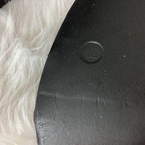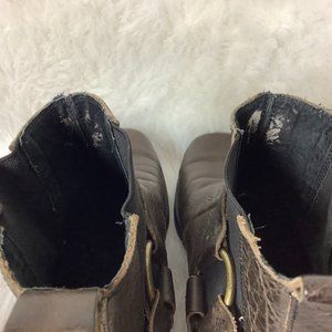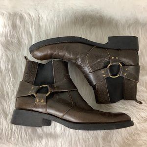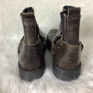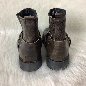 This is a pair of brown distressed leather, brass tone circle, harness strap Chelsea moto biker boots from Bed Stu. Creasing on the vamp. Some wear on foot beds and soles. Fabric size label is missing, size is on the insole. Motorcycle