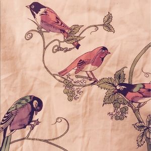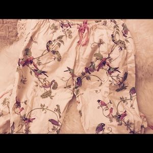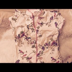 The top of the set is a short sleeve Asian style button down with mother-of-pearl buttons and pink details. The pants have a pink draw string and wide legs. The size is L but the top is a tighter fit. Perfect condition. Never worn but purchased many many years ago. Cotton and excellent quality. Amazing and unique bird print in pinks purples and greens which is the best part!