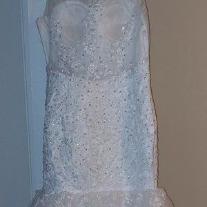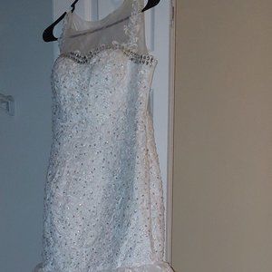 It is bedazzled in beautiful silver stones near the neckline and has a lovely train. This dress has a side zipper so you can easily put it on without having to pull the entire thing over your head and body and features a mesh-like neck and backline.