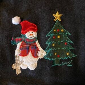 Features-Has pockets, Outer 100% Wool, Lining 100% Cotton. Features Christmas tree, snowman, snowflakes, plaid details
