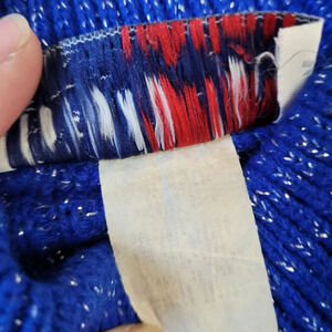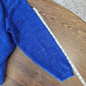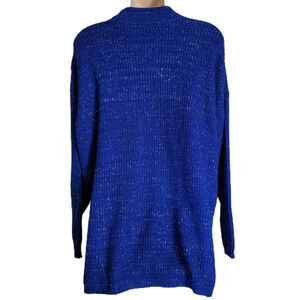 crewneck tunic style sweater in royal blue with silver metallic threads throughout. Side slits at the bottom, slightly tapered straight fit. Medium weight acrylic, in excellent vintage condition. The size tag is faded. no other flaws to note.