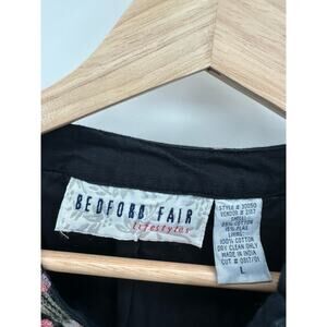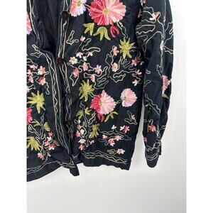 Bedford Fair Women Black Floral Embroidery Button Down Jacket Cotton Flax Size L