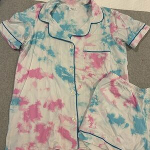 Vibrant tie-dye design. Short-sleeve top with button front. Comfortable shorts. Perfect for bedtime.