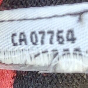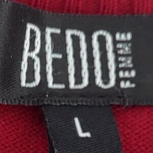 Bedo Femme lightweight long sleeved red/orange/black crew neck sweater, size L. 5 buttons on lower left side. Label has been cut off, but probably an angora/wool blend. Very soft. Approximate measurements: neckline to hem - 24"; sleeves - 25"; armpit to armpit - 18".