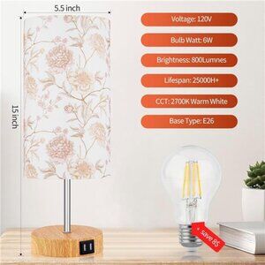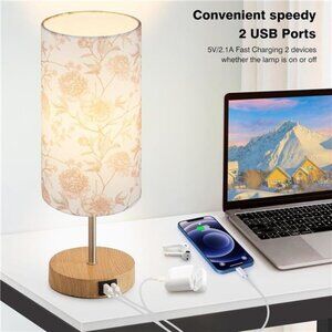 Bedside Touch Lamp, Wood Small Table lamp with 2 USB Charging Ports & Flower