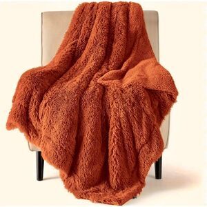 Bedsure Burnt Orange Fuzzy Shaggy Faux Fur Throw Blanket 50" x 60". Faux fur, soft and thick, fizzy and cozy. Item in excellent New in box condition. No known rips, tears, holes, stains or defects.