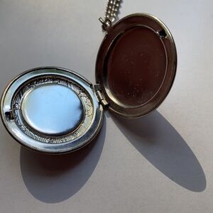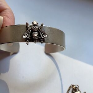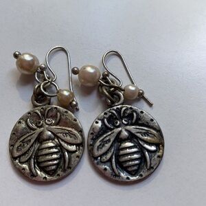 Beautiful set of bees jewelry. Four pieces included. One set of dangle earrings with two pearls and bee pendants. One bangle bracelet. One necklace with gold and silver accents featuring honeycomb and gold bee. Locket with bee long talisman pendant.